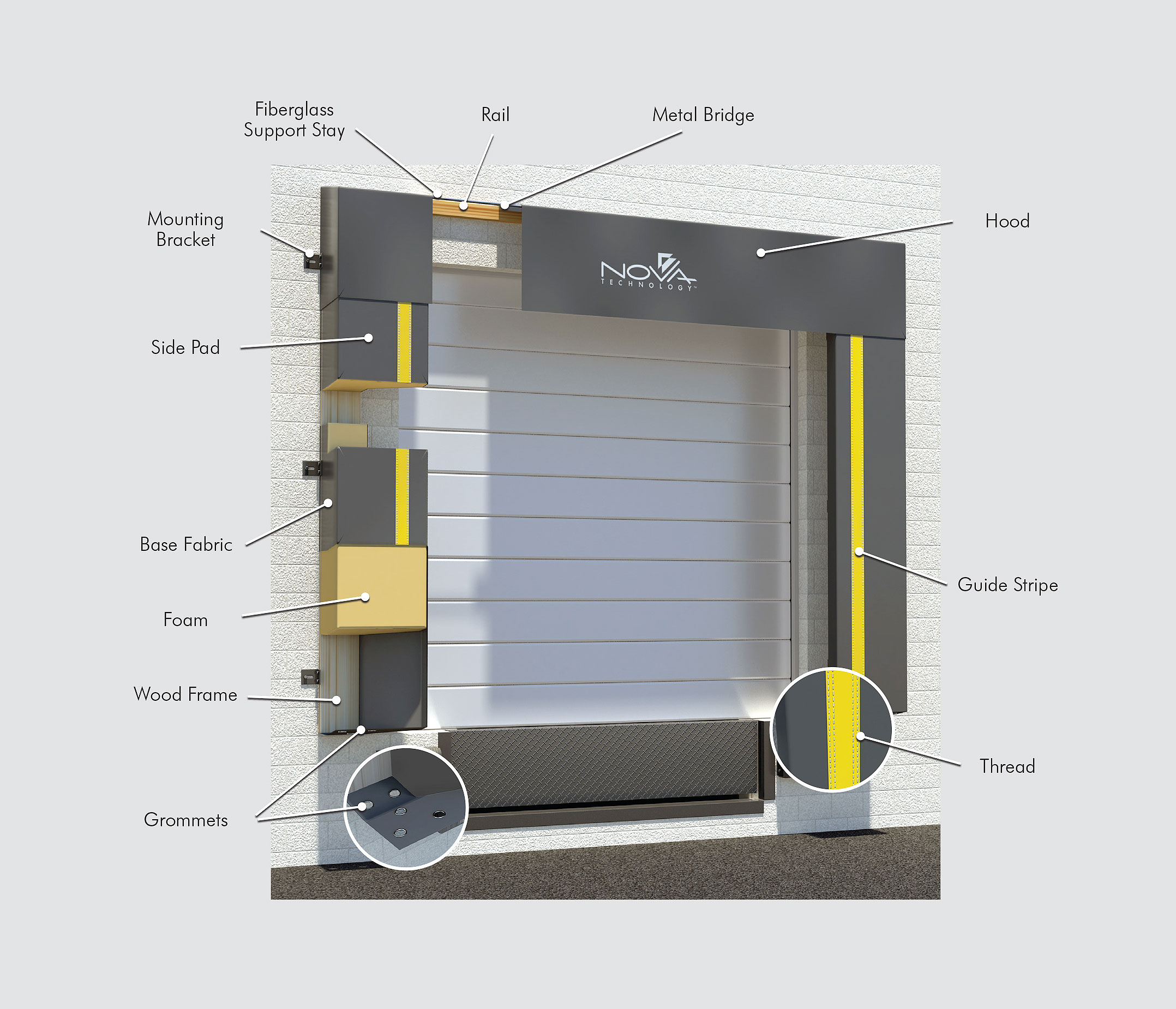 El sello de andén universal de almohadilla de espuma con capota cuenta con una cortina de lona estilo capota y almohadillas laterales de espuma. Este modelo se adapta a puertas más altas y ofrece un sello positivo contra los lados del camión.